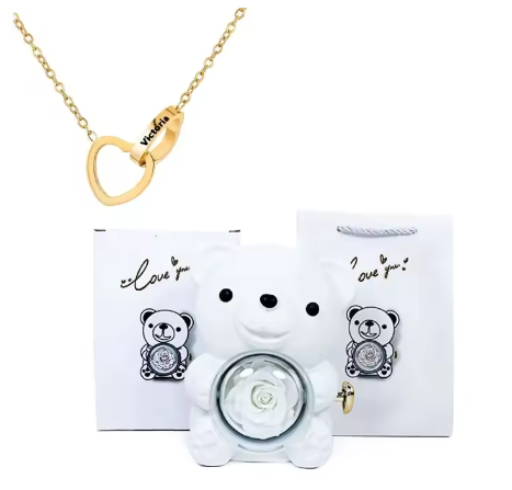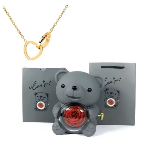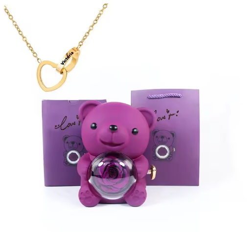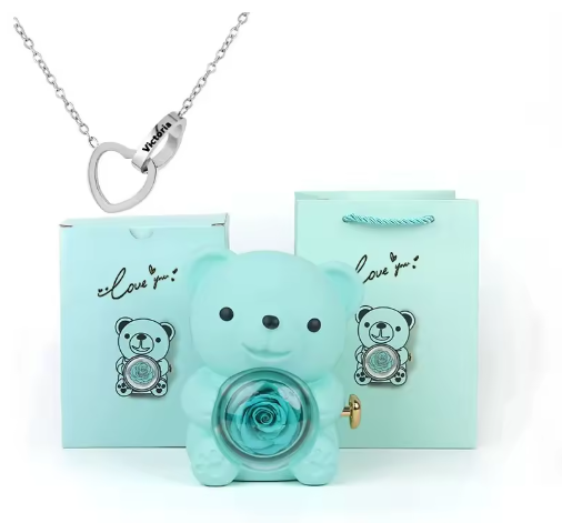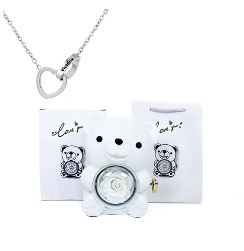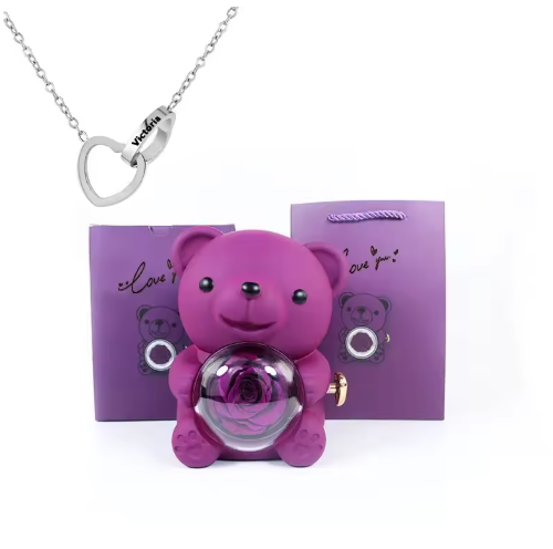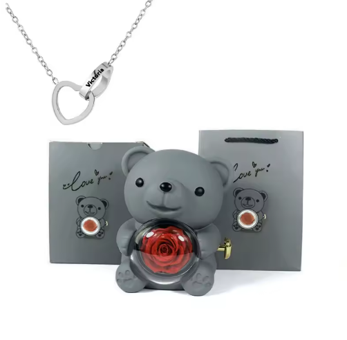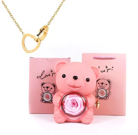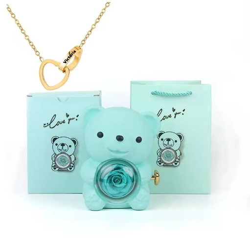 To pudełko na prezenty z misiem Wieczna Róża ma elegancki wygląd z obracającą się różą. Jego niewielkie rozmiary ułatwiają noszenie, dzięki czemu jest idealnym prezentem na specjalne okazje.